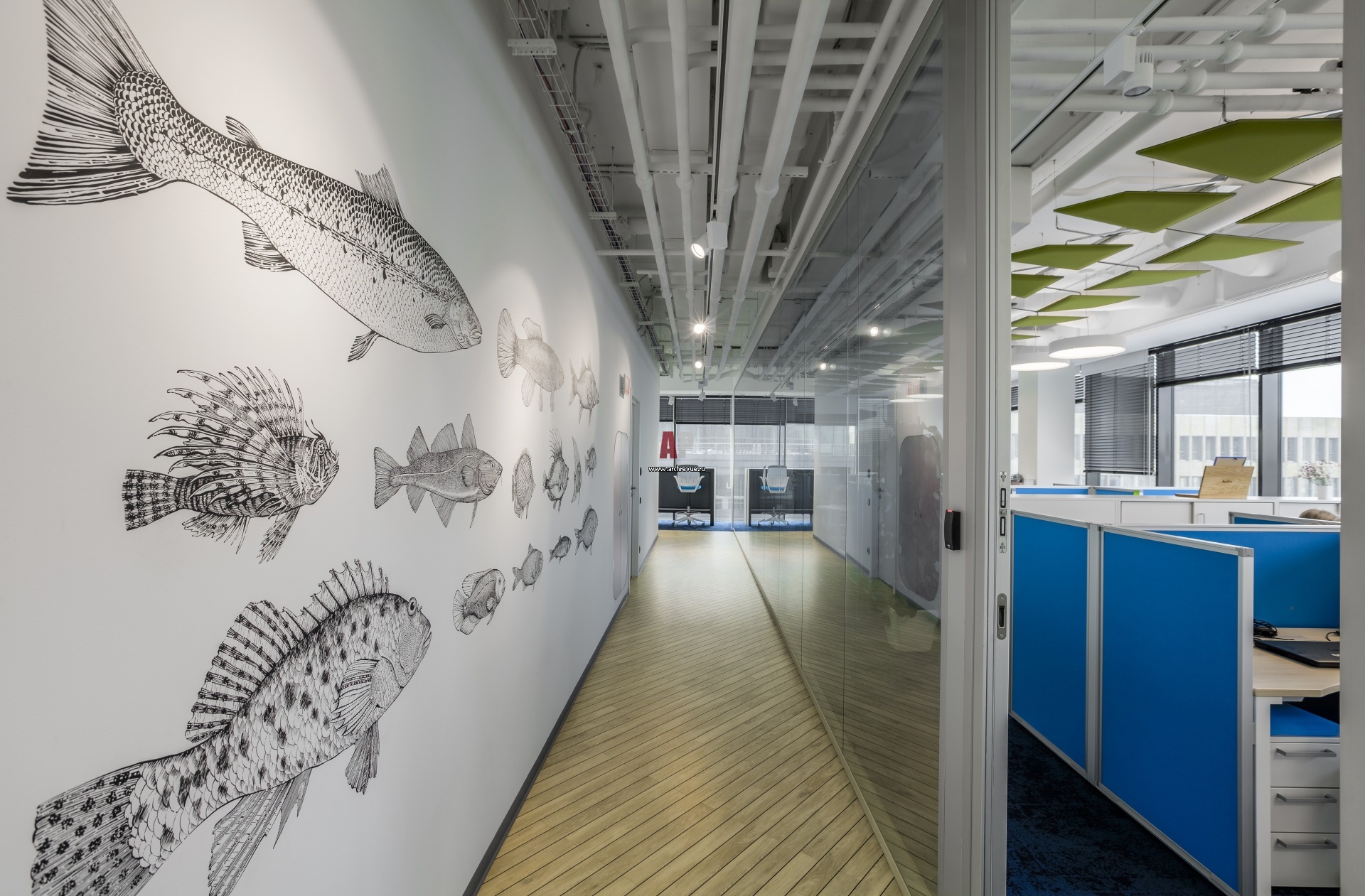 Рабочий open-space. Интерьер офиса выполнен в морском стиле.