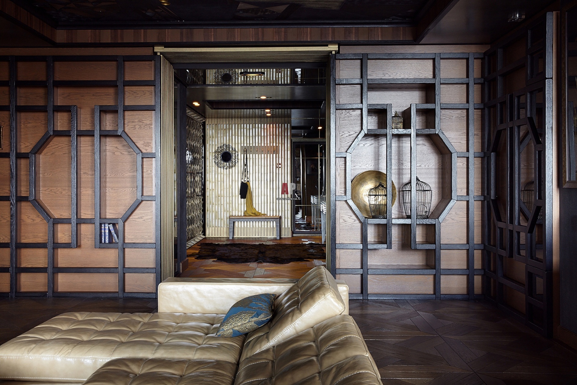 Холл объединен с гостиной широким порталом со встроенными стеллажами в китайском стиле. Огромный лакированный шкаф в прихожей выполнен по эскизам автора проекта.