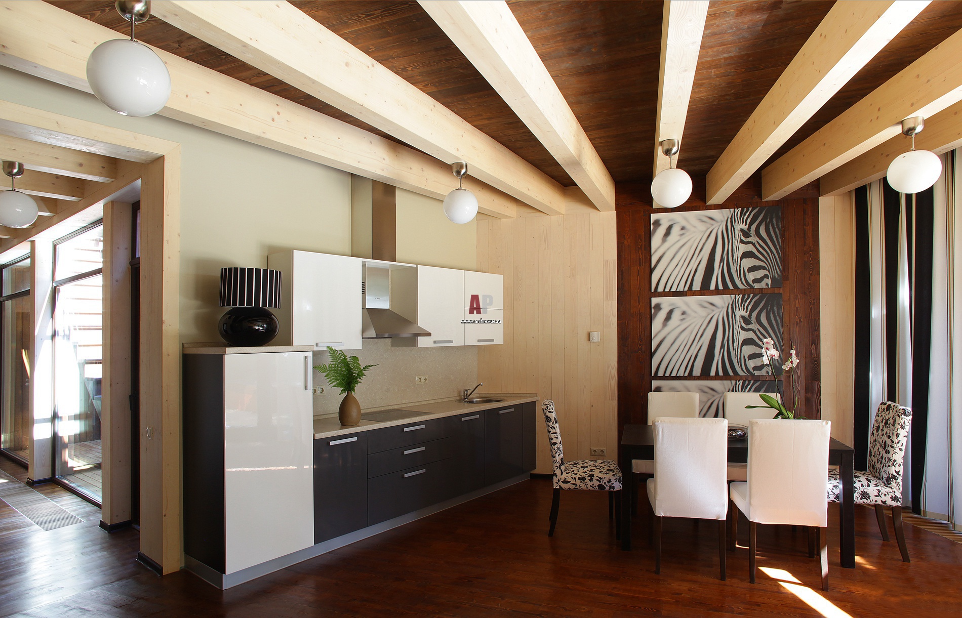Во внутренней отделке авторы также миксуют светлое дерево с тонированным, добиваясь богатых визуальных эффектов.