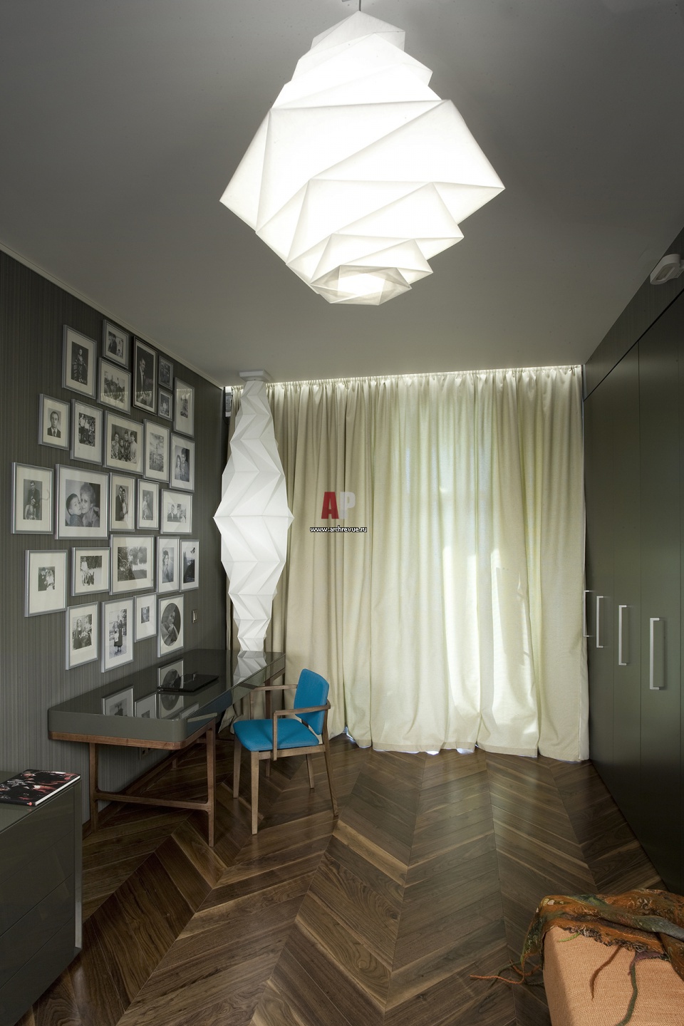 На фото – интерьер мужского кабинета в квартире. Светильники были разработаны японским дизайнером Иссэй Миякэ, в основу их дизайна заложен принцип оригами.