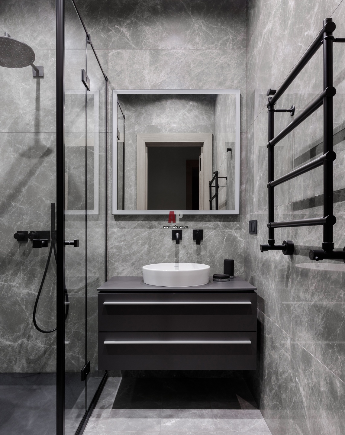 Гостевой санузел с душевой выполнен в брутальной мужской стилистике. Раковина, Duravit. Керамогранит, Casalgrande Padana.