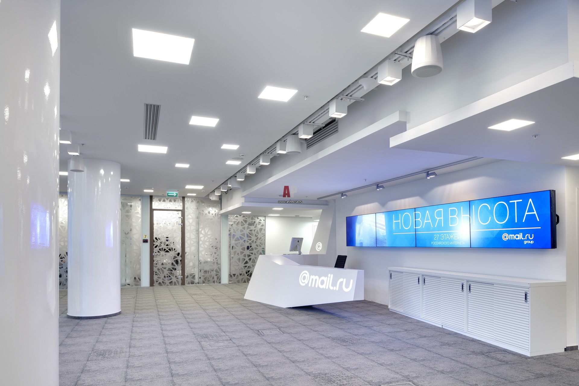 Стойка рецепции имеет необычную форму – она выполнена из белого кориана и похожа на ледяные глыбы. На белой поверхности транслируется логотип компании.