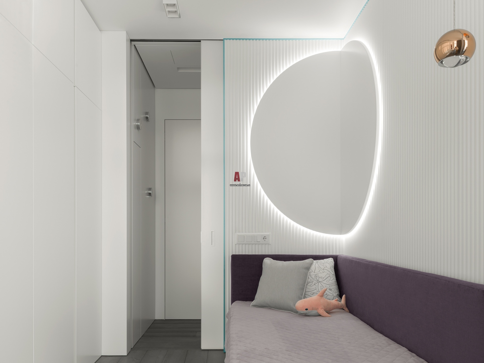 Примечательная деталь обеих детских – оригинальные светильники: соединенные под прямым углом масштабные полукружья с подсветкой по периметру. Панели, встроенная мебель, на заказ, изготовление «АФ Ника». Кровать, Lago.