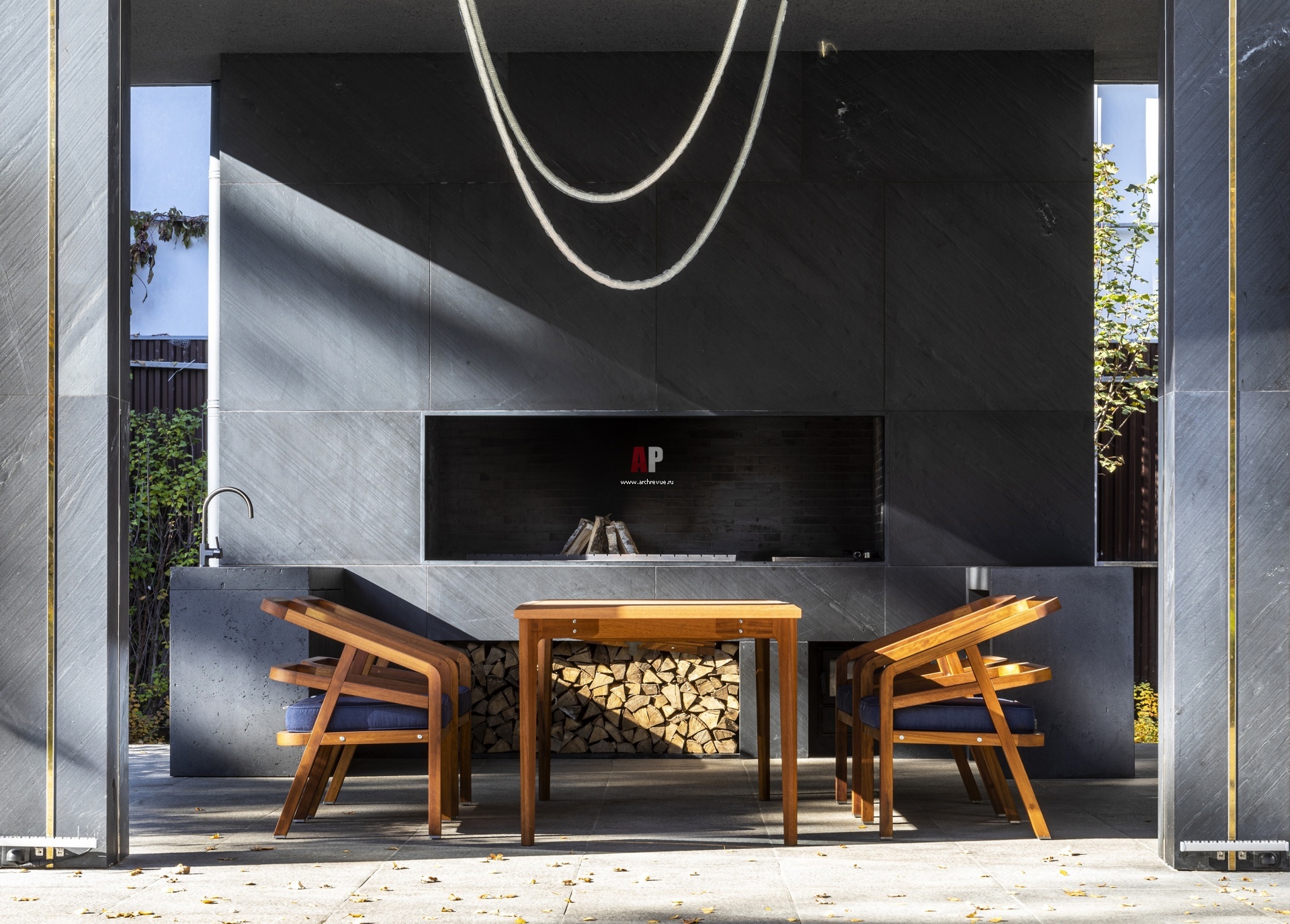 С улицы дом огибает единая терраса, композиционно и функционально связывая помещения. В торце бассейна расположена зона барбекю под кровлей с отрытым мангалом. Композиция мангала облицована натуральным сланцем, тумбы выполнены из черного микроцемента.