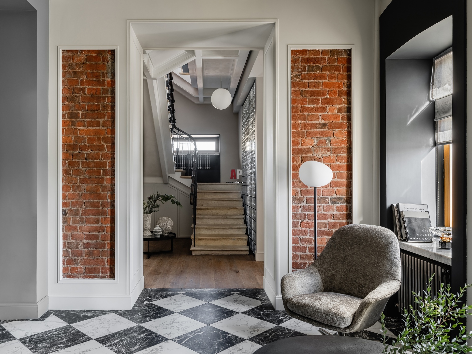 Холл первого этажа. Кирпичный фрагменты стен – это кирпич старый, сохраненный со времен постройки самого здания 1908 года.