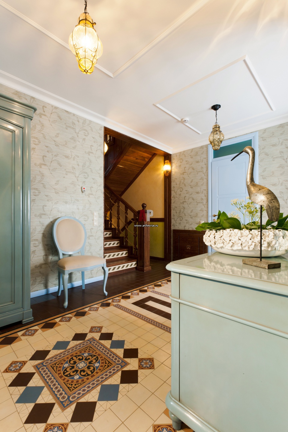 Интерьер холла с английской плиткой. Серо-голубой цвет в отделке проемов, плинтуса и мебели перекликается с цветом деталей мозаичного рисунка. Мебель, Roche Bobois.