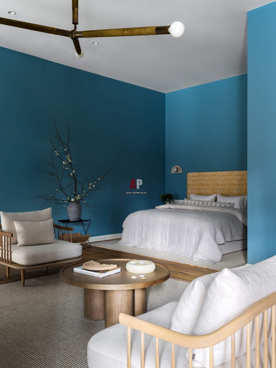 Гостевая голубая спальня. Изголовье кровати обито тканью Quadrille Fabrics в цвете Inca Gold. Бра, Allied Maker. Ковер из сизаля и шерсти, Сrucial Trading.