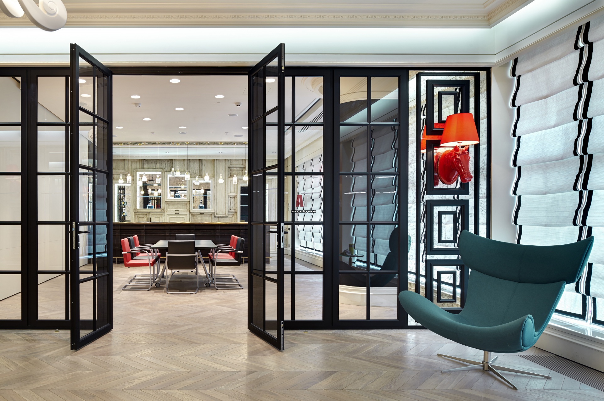 Стационарная перегородка из темного дерева и стекла обозначает вход в клубную зону.