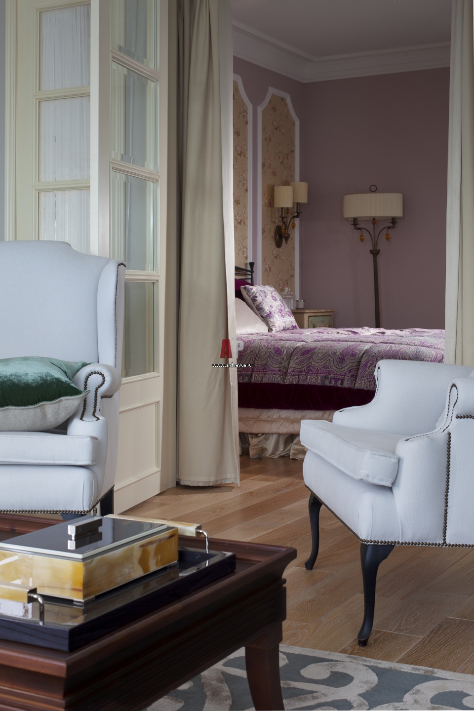 Вид из гостиной на спальню. Помещения разделены деревянными дверями-ширмами, а также плотными портьерами пастельного цвета.