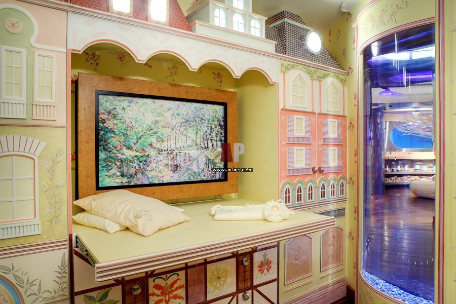 Вторая детская комната оформлена оригинальной системой хранения в виде сказочных домиков с башенками, расписанных вручную. Шкафы изготовлены по эскизам авторов проекта мастерами компании «БКС», Tudor.