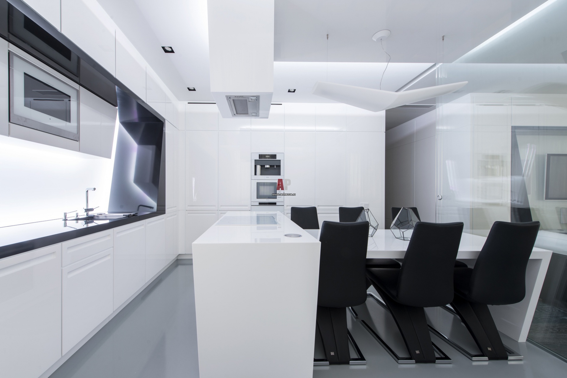 Белый обеденный стол сделан на заказ. Черные стулья, Rolf Benz. Люстра, Artemide.