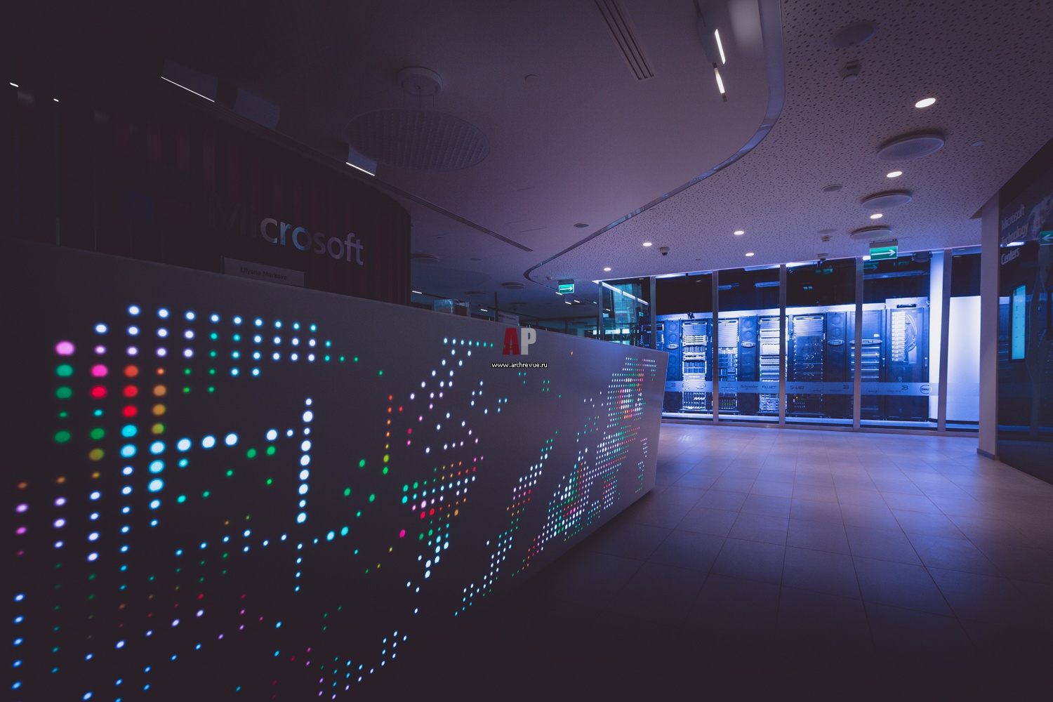 Одна из ключевых деталей интерьера – стеклянная демонстрационная серверная с цветной подсветкой. Стойка ресепшен также снабжена специальной подсветкой. С ее помощью на белый кориан выводятся разноцветные световые сценарии.