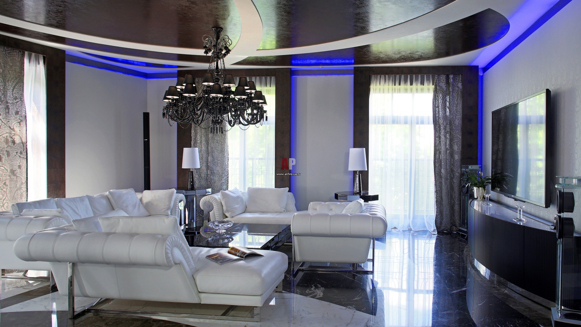 Мягкая группа в гостиной. Белые кожаные диваны, Visionnaire. Черная люстра, Fendi.