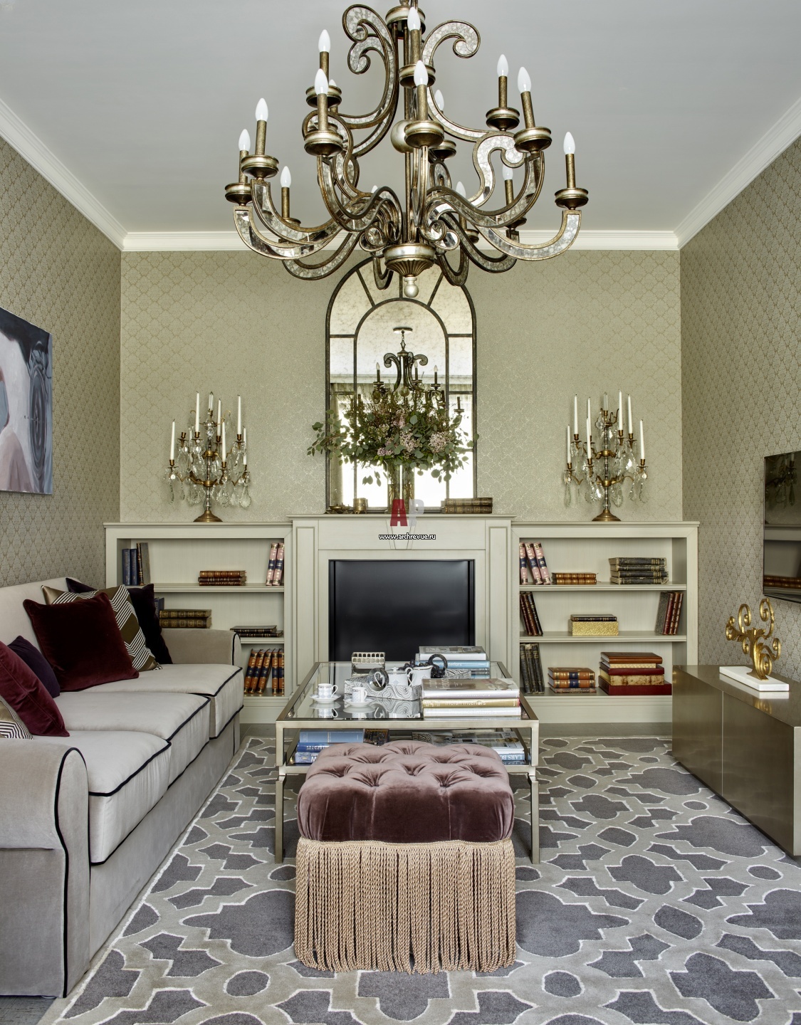 Интерьер гостиной выполнен в теплой серо-бежевой палитре. Камин обрамлен стеллажами из светлого дерева. Центральная люстра, светильники, Eichholtz.
