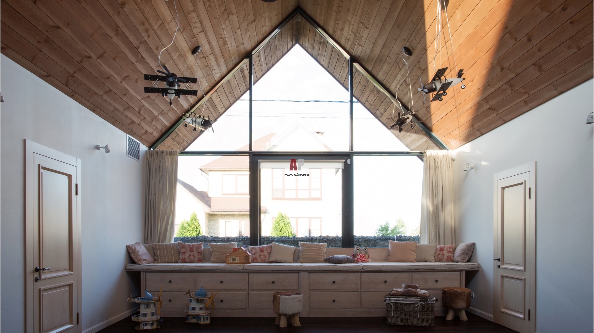 Фото интерьера детской. На подшитом деревянном потолке интересно выглядят светильники в виде самолетов.