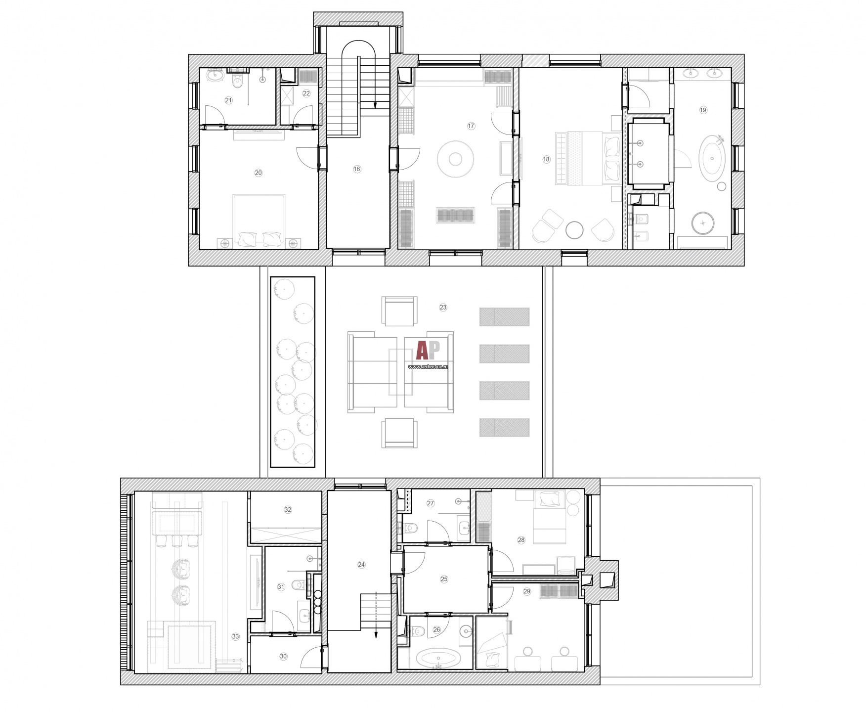План второго этажа трехэтажного дома в лесу. Общая площадь – 850 кв. м.