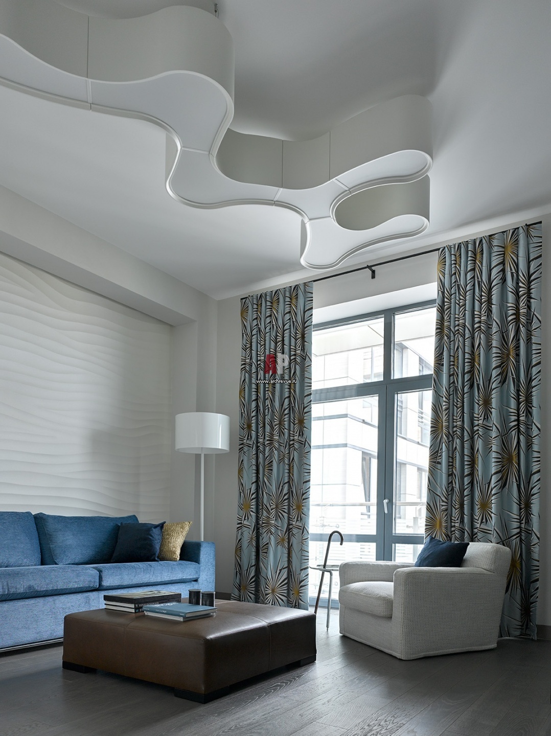 Синяя гостевая комната. Потолочный светильник обтекаемой формы, Vibia. Торшер, Flos. Диван, Asnaghi Interiors. Кресло, Jesse. Пуф, Meridiani. На стене – панели их гипса с 3D-эффектом. Шторы, Jim Thompson.