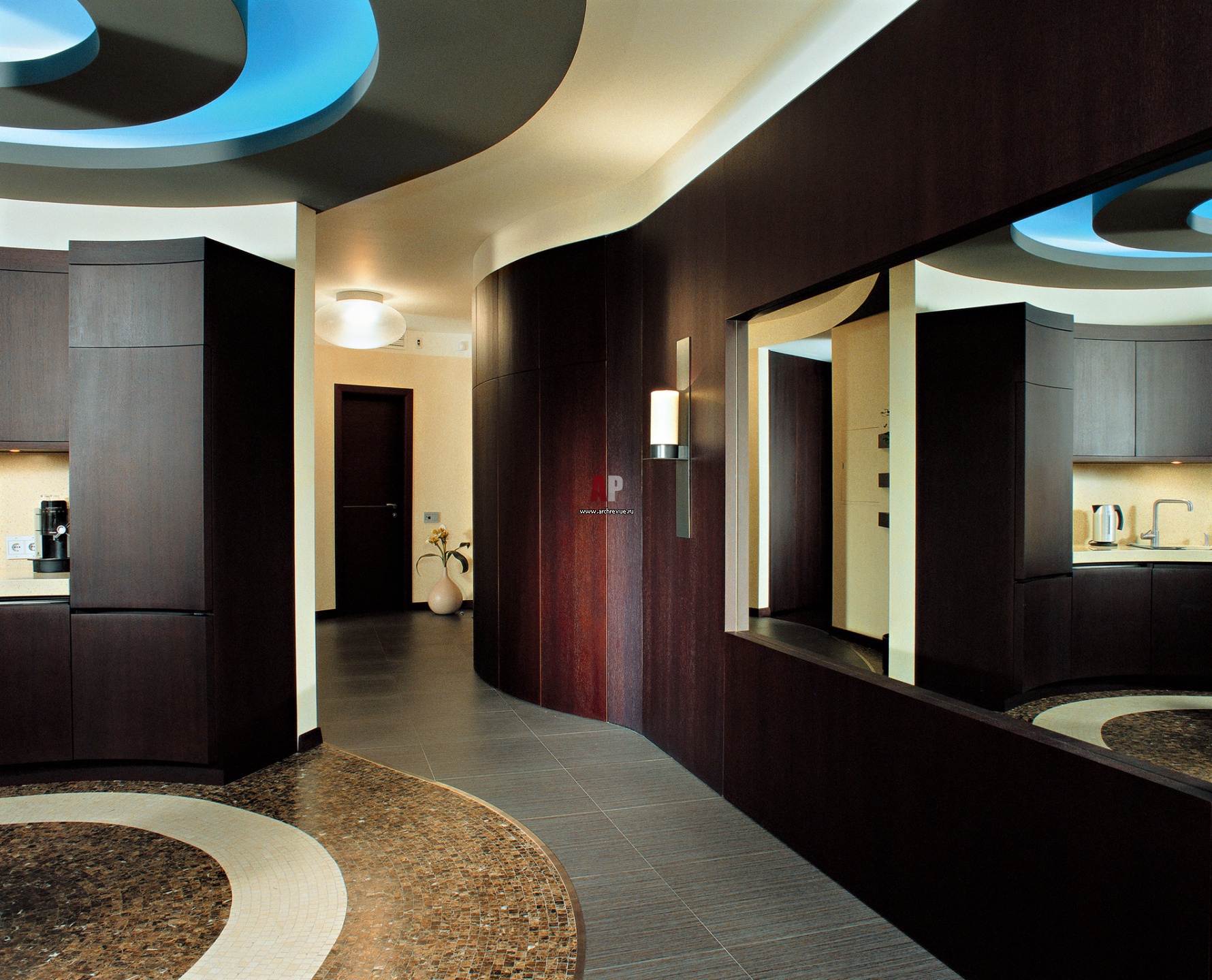 Прихожая в современном стиле. Встроенный шкаф и декоративные панели выполнены по индивидуальному проекту из темного дерева. В основе композиционного решения пространства квартиры – правильная форма круга, текучие линии, дуги и пластичные объемы.