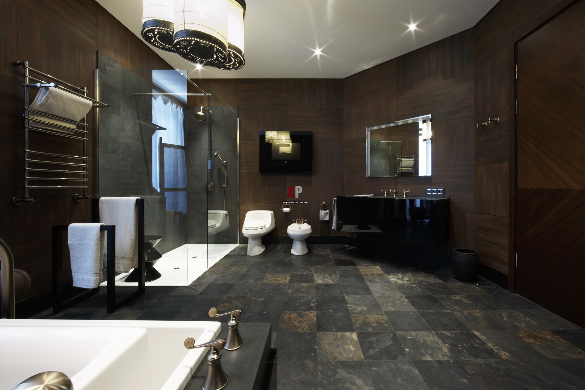 Хозяйская ванная, вид на душевую. Рисунок деревянной раскладки стен рифмуется с каменной кладкой пола.