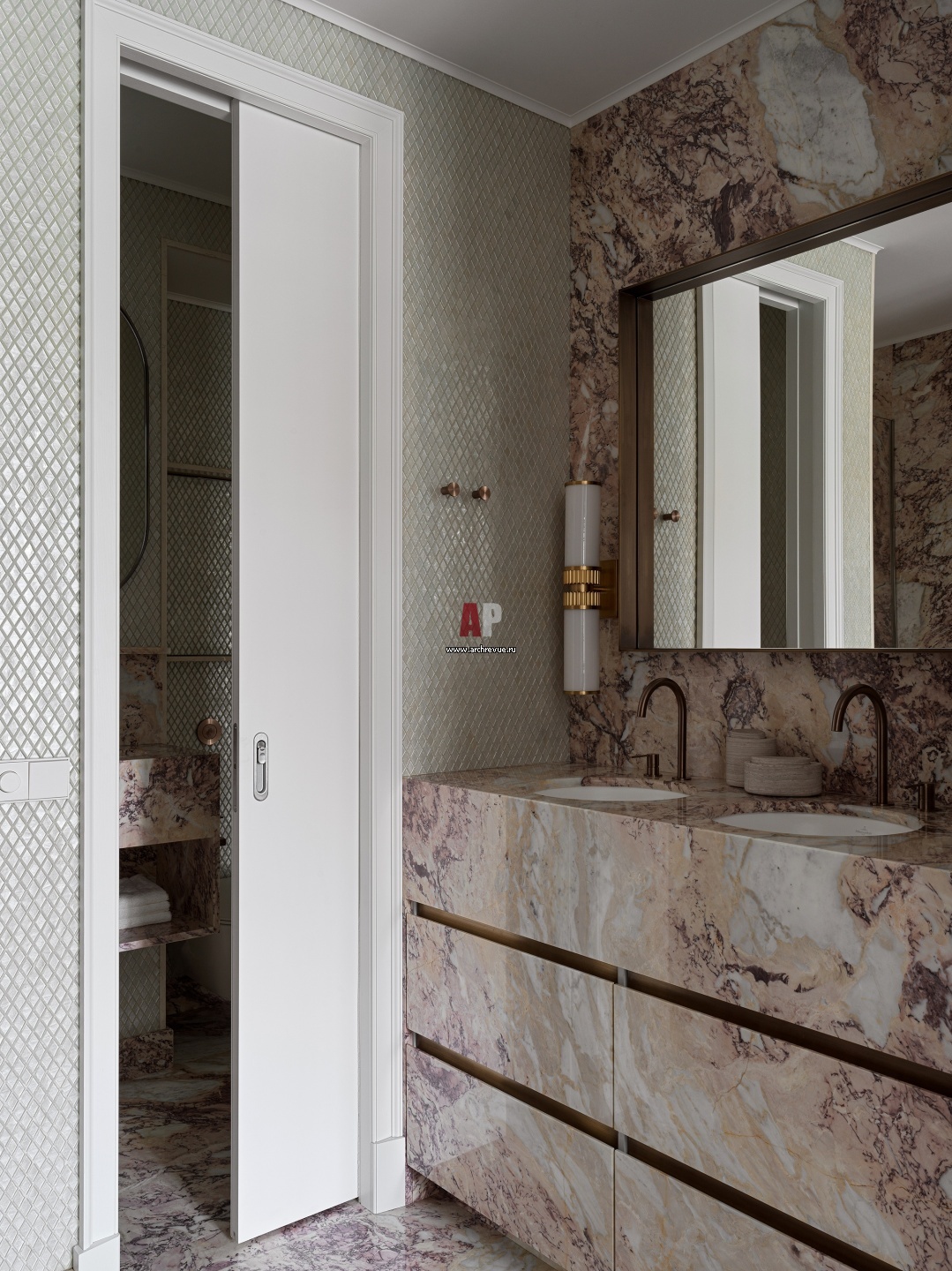 Из-за нехватки площади туалетный блок сделан общим для мастер-ванной и гостевого санузла. Места для размещения двух унитазов не хватало, тогда возникла идея объединить два санузла при помощи раздвижной двери. При необходимости гостевой санузел можно сделать изолированным, чтобы у гостей не было доступа в хозяйский блок. Бра, Hudson Valley Lighting.