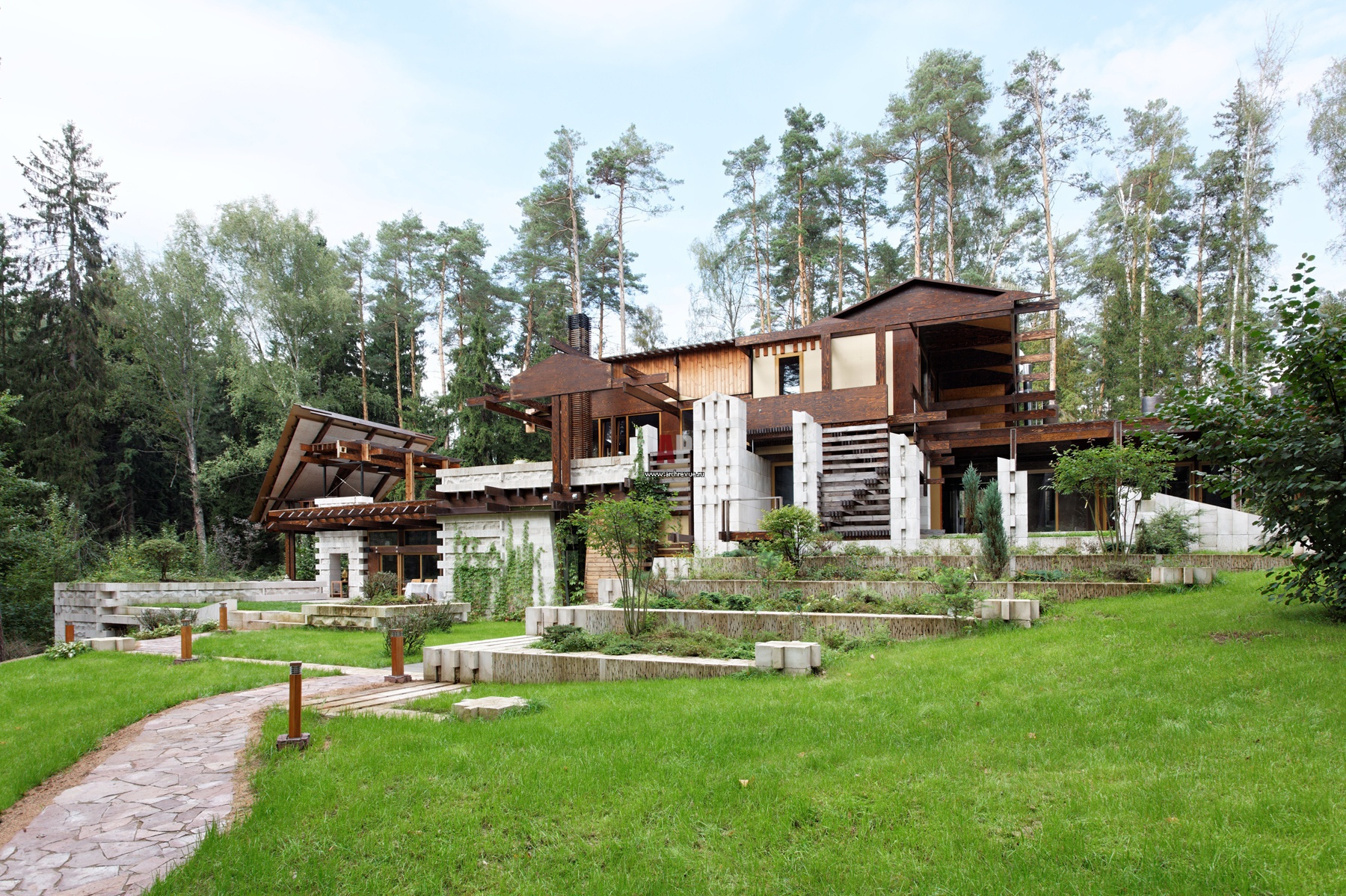 По рельефу ступенчато спускаются террасы с ландшафтным благоустройством. При озеленении участка использовались только местные растения: сирень, рябина, орешник. Они наиболее комфортно и естественно чувствуют себя в климатических условиях средней полосы.
