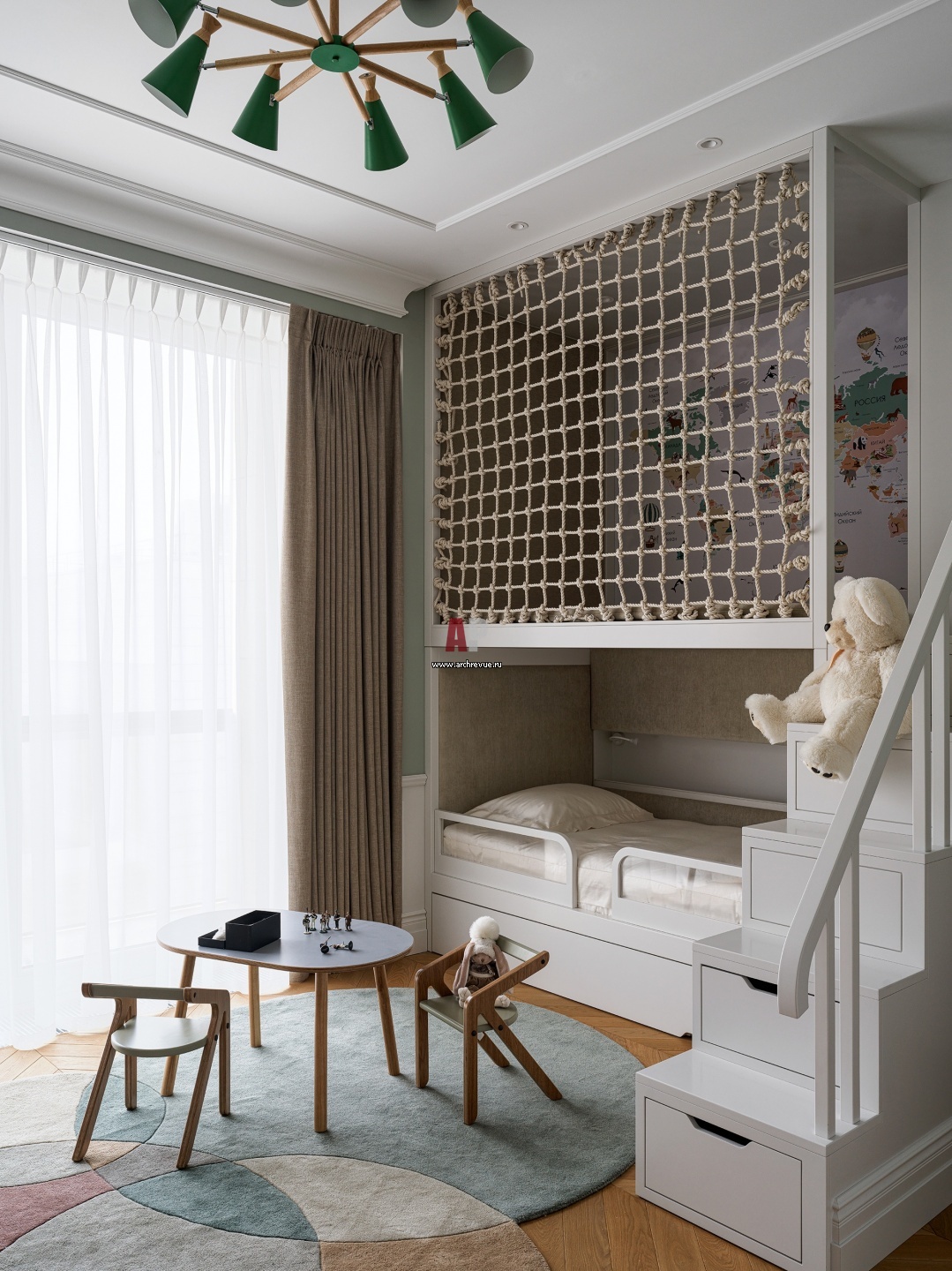 Детская комната на первом этаже. Вся мебель, включая шкафы и двухъярусную кровать с верхним этажом для игр – индивидуальное столярное исполнение.