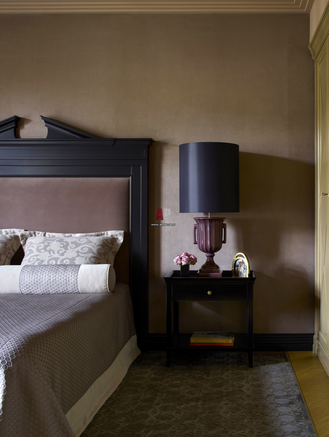 Интерьер спальни с элементами итальянской классики. Встроенный шкаф, AM Classic. Прикроватные тумбы, Mis en Demeure. На них лампы с керамическим основанием и чернично-черным абажуром, Mis en Demeure.
