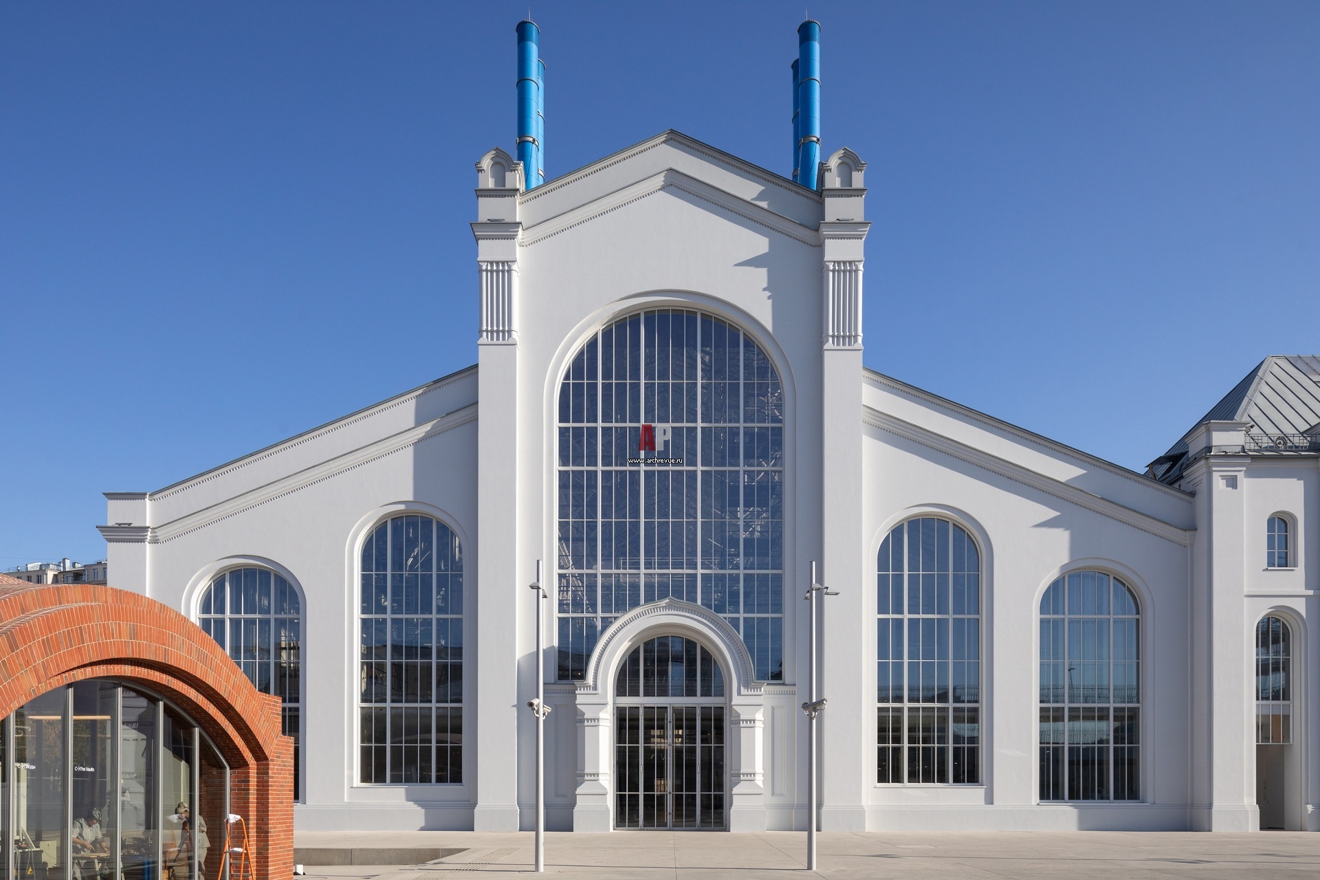 Исторический фасад окрашен в нейтральный светло-серый цвет и растворяется в городской среде. Витражи восстановленные, выполнены из современного высокотехнологичного стекла.