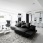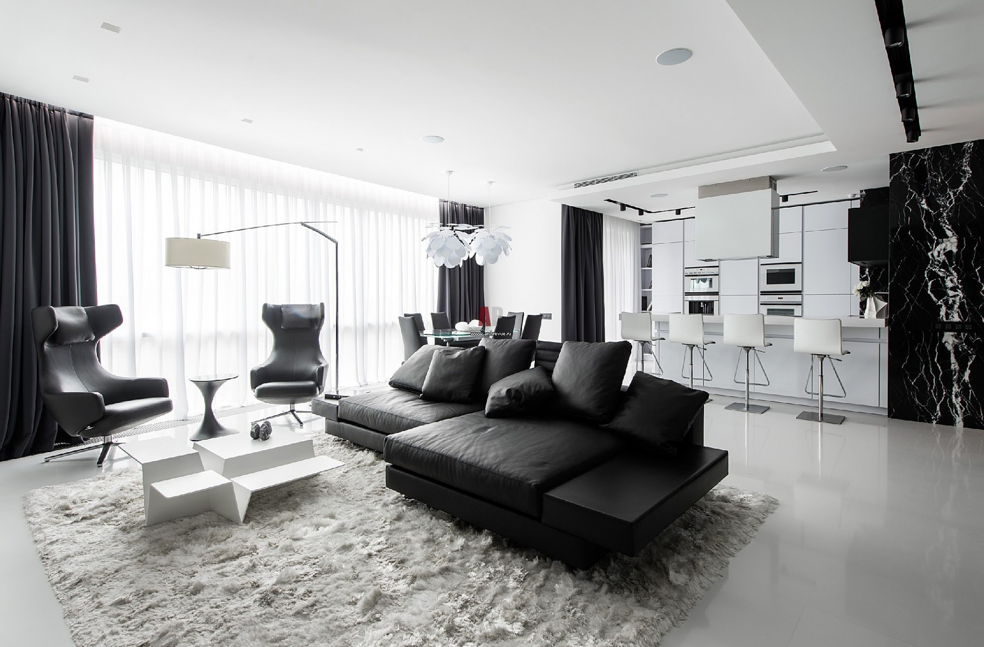 Интерьер черно-белой гостиной в стиле минимализм. Диван, Minotti. Кресла, Vibia. Барные стулья, Rolf Benz. Кофейный столик, Ligne Roset.