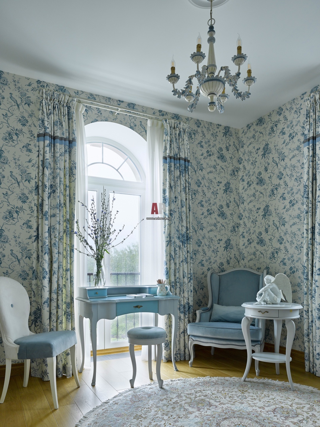 Голубая комната была задумана как чайная, но со временем стала местом для уединения хозяйки. Обои, шторы с цветочным рисунком, Sanderson. Свет, Chelini.