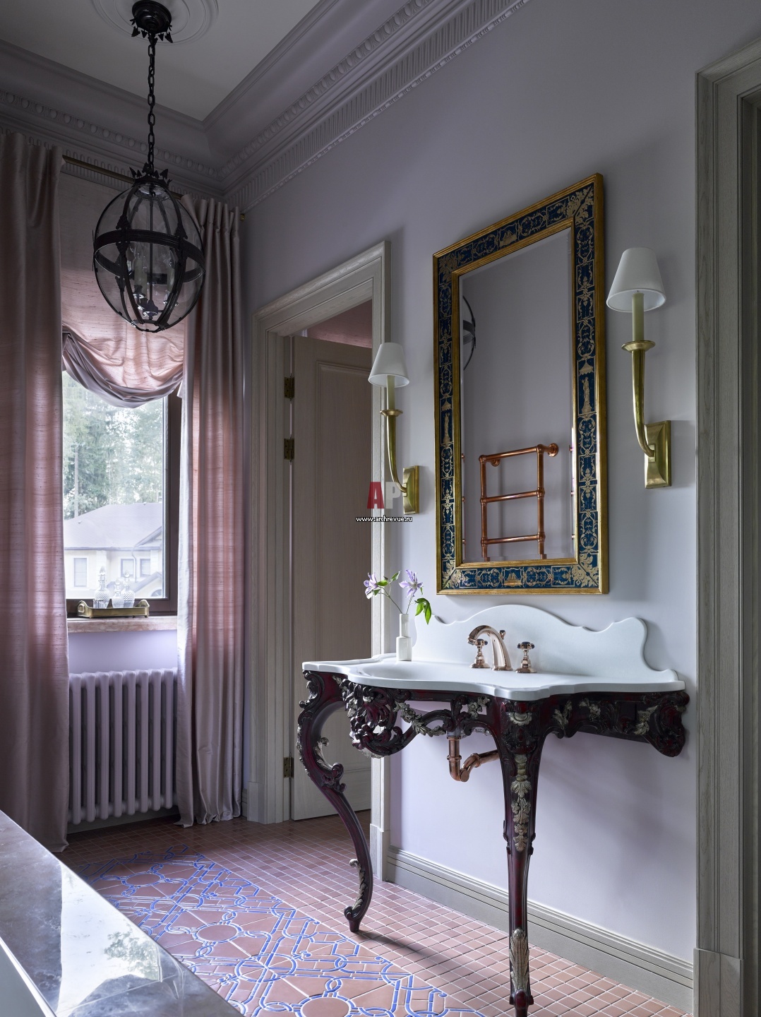 Интерьер санузла. На полу – керамическая плитка ручной работы. Консоль с раковиной, Chelini. Смесители с лазуритом, Nicolazzi. Зеркало, Jonathan Charles. Светильники потолочные, Charles Edwards. Бра, Nicholas Haslam.