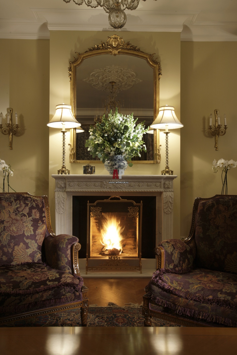 Камин в гостиной. Антикварный камин из белого мрамора с литым чугунным обрамлением топки.