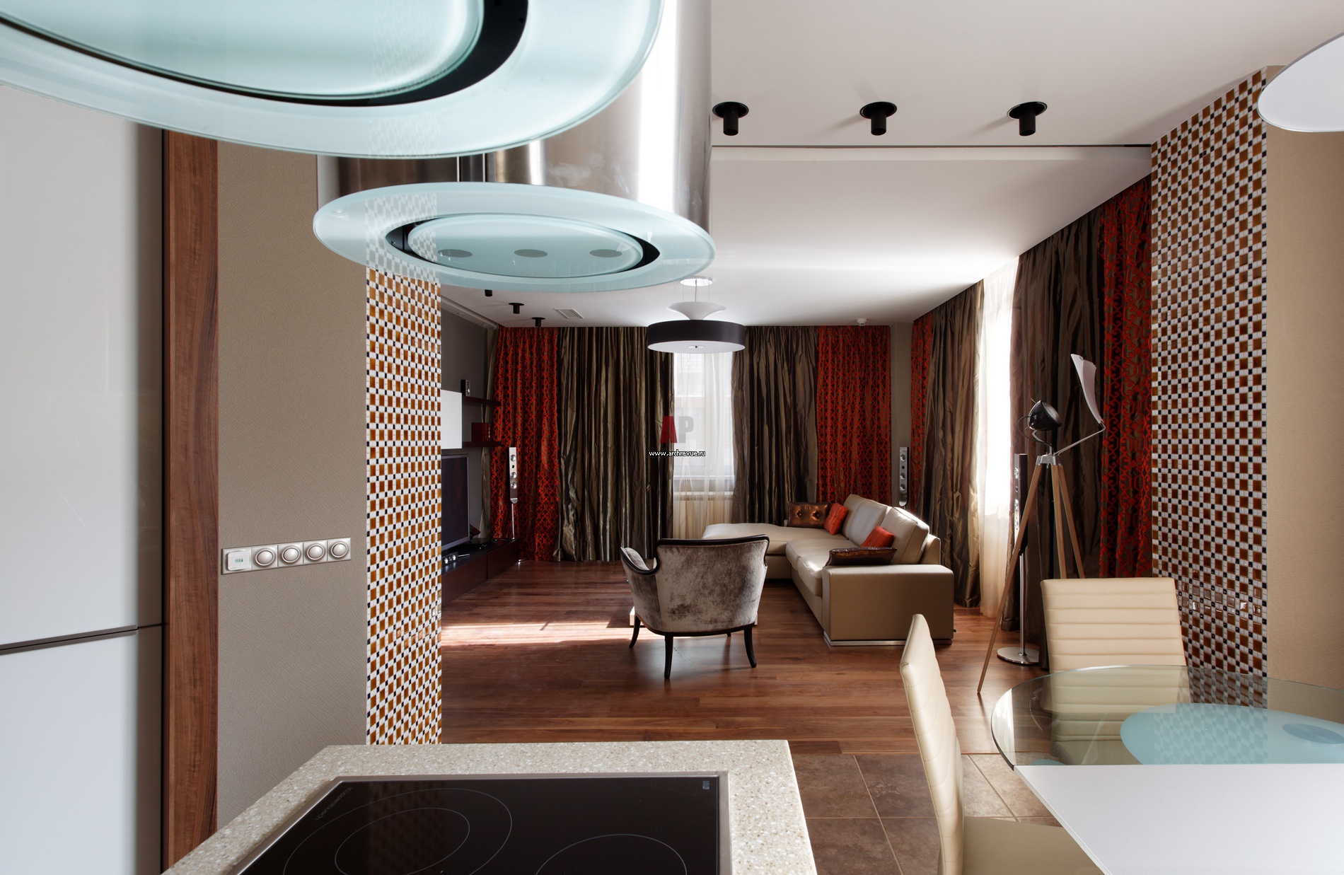 Вид из кухни на зону гостиной. Мозаичный декор простенков акцентирует вход в кухню.