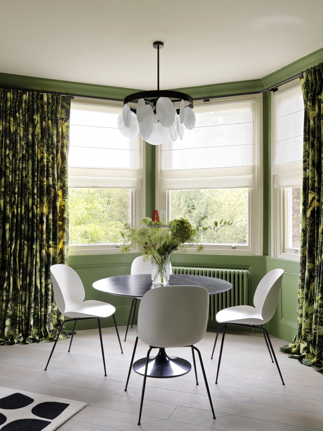 В эркере общей гостиной размещена столовая группа. Над обеденным столом – люстра из черного металла и стекла ручной работы, CTO Lighting.