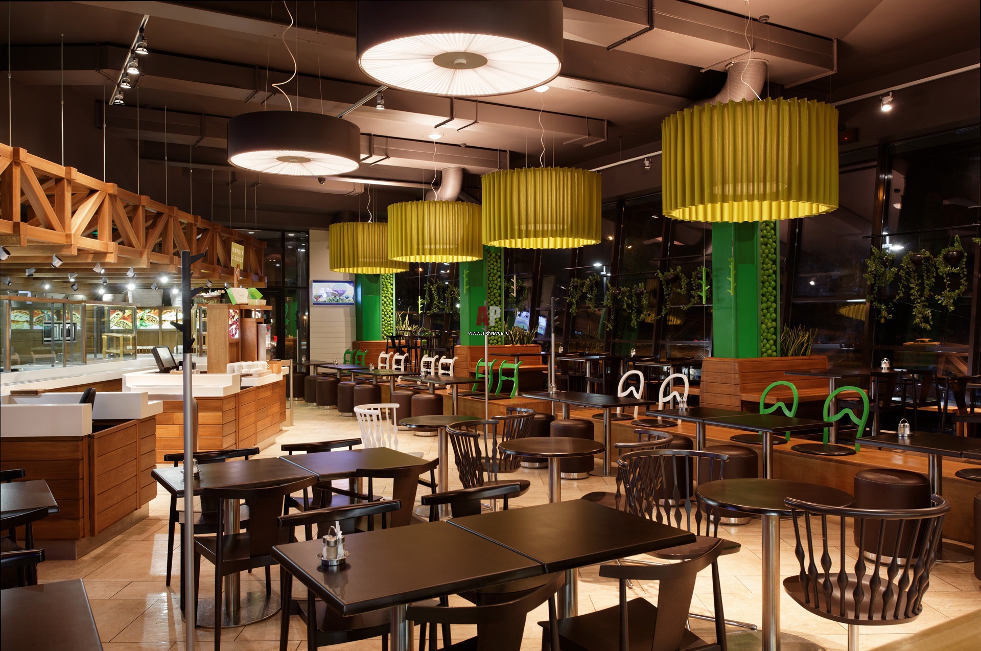 В дизайне интерьера ресторана использована креативная дизайнерская мебель от Andreu World, Metalmobil, Pedrali. Обилие фактуры натурального дерева объяснятся эко направленностью интерьера заведения.