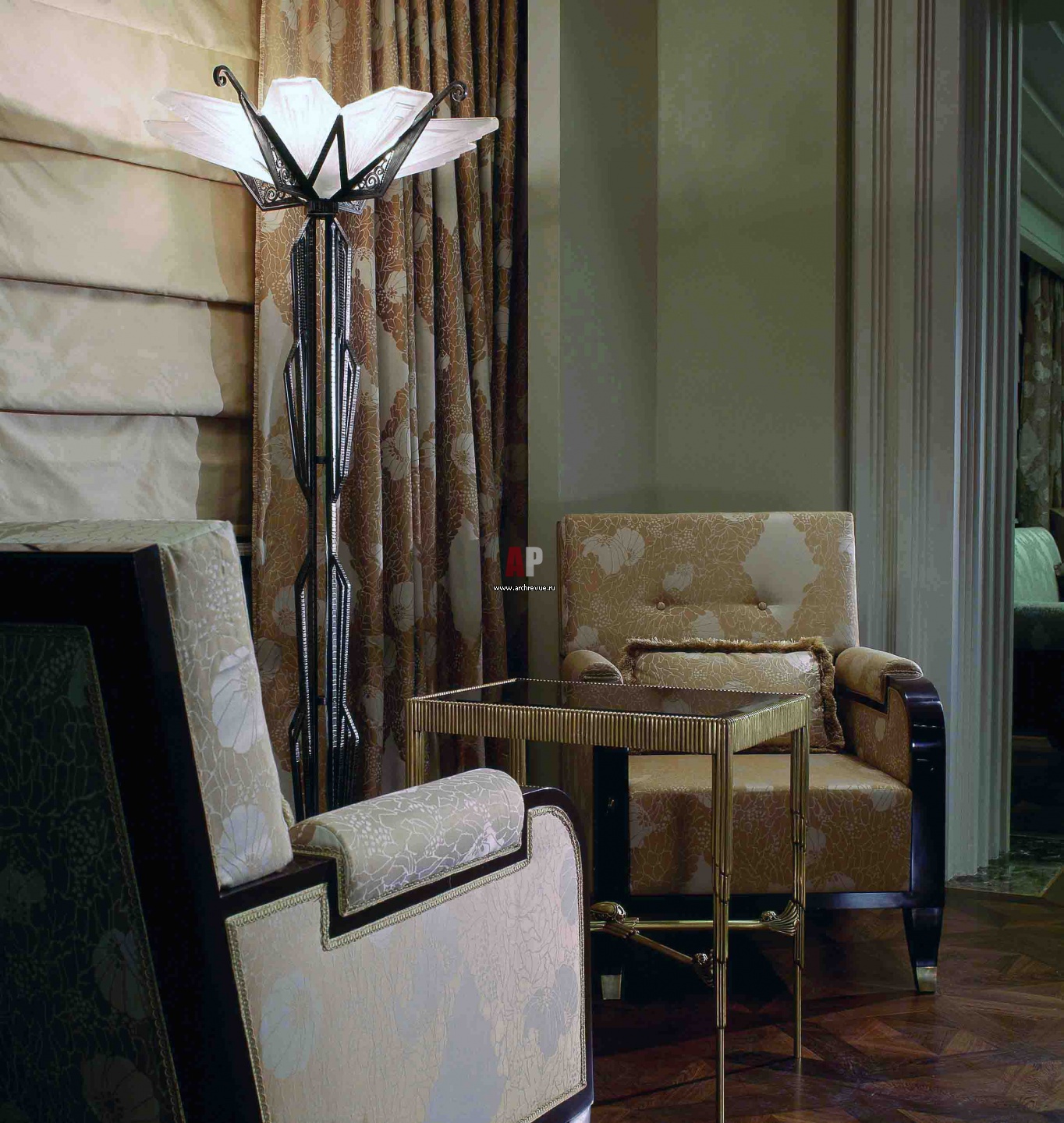 Фото интерьера кресельной группы в представительском офисе. Портьеры и кресла обтянуты шелковым дамастом, вытканным по эскизам знаменитого Эмиль-Жака Рульманна для Prelle, 1920 год. Торшер, дизайн Эдгара Брандта, 1930-е годы.