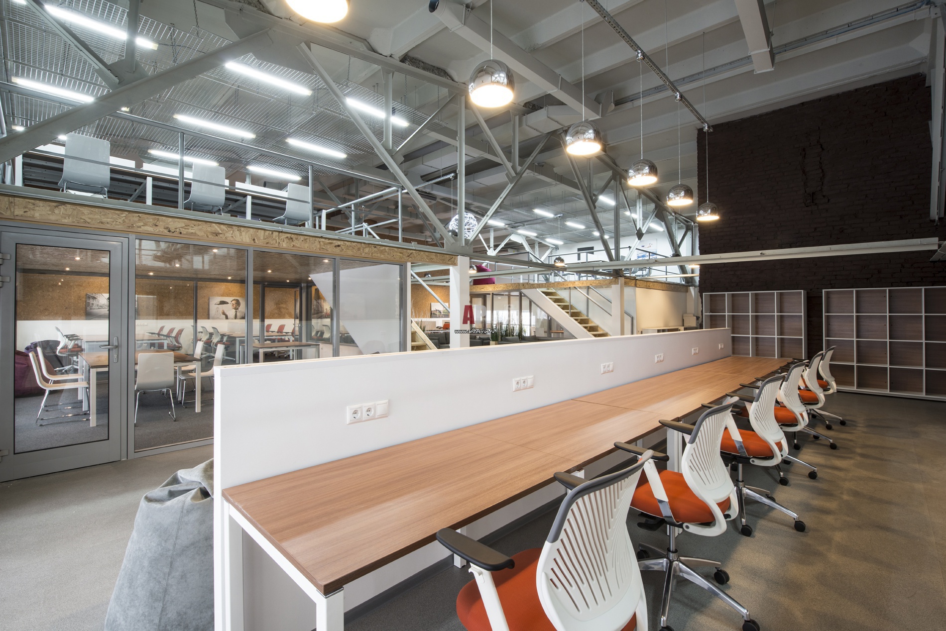 Интерьер офиса в стиле лофт с надстроенными сварными антресолями.