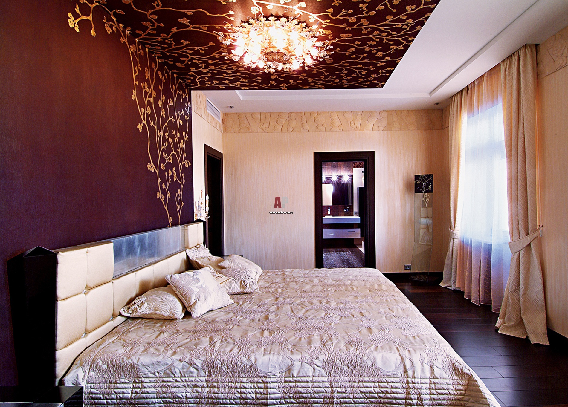Фото интерьера спальни в стиле гламур с цветочным орнаментом в золотисто-шоколадных цветах.