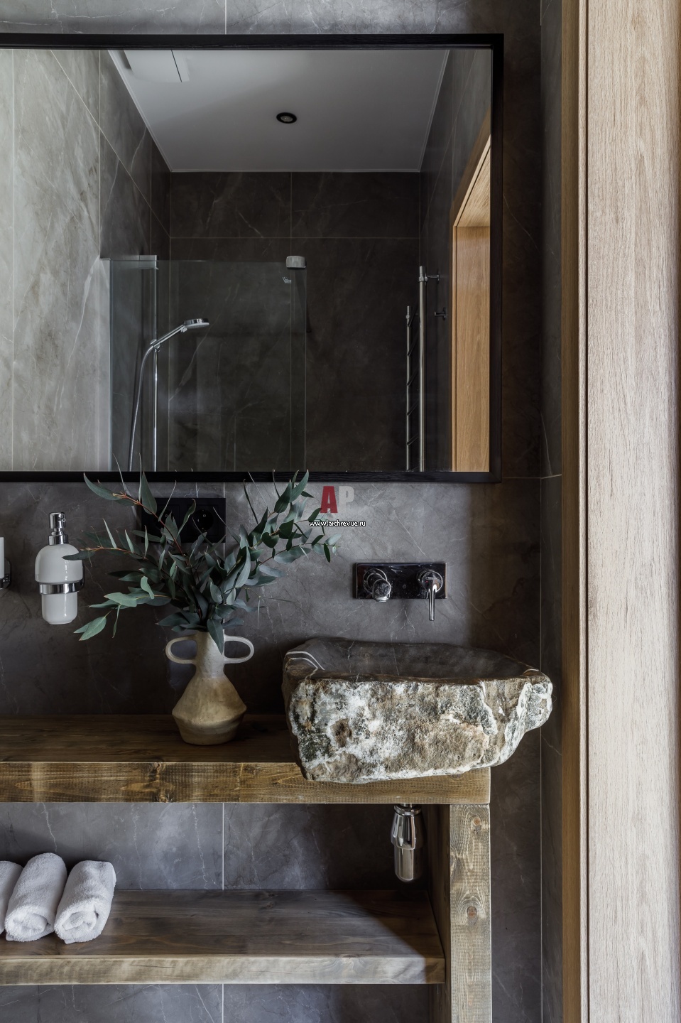 Гостевой санузел небольшой, но в нем есть душ, унитаз и раковина и речного камня. Она сделана местным мастером на заказ. Пространство помогает увеличить большое зеркало над умывальником.