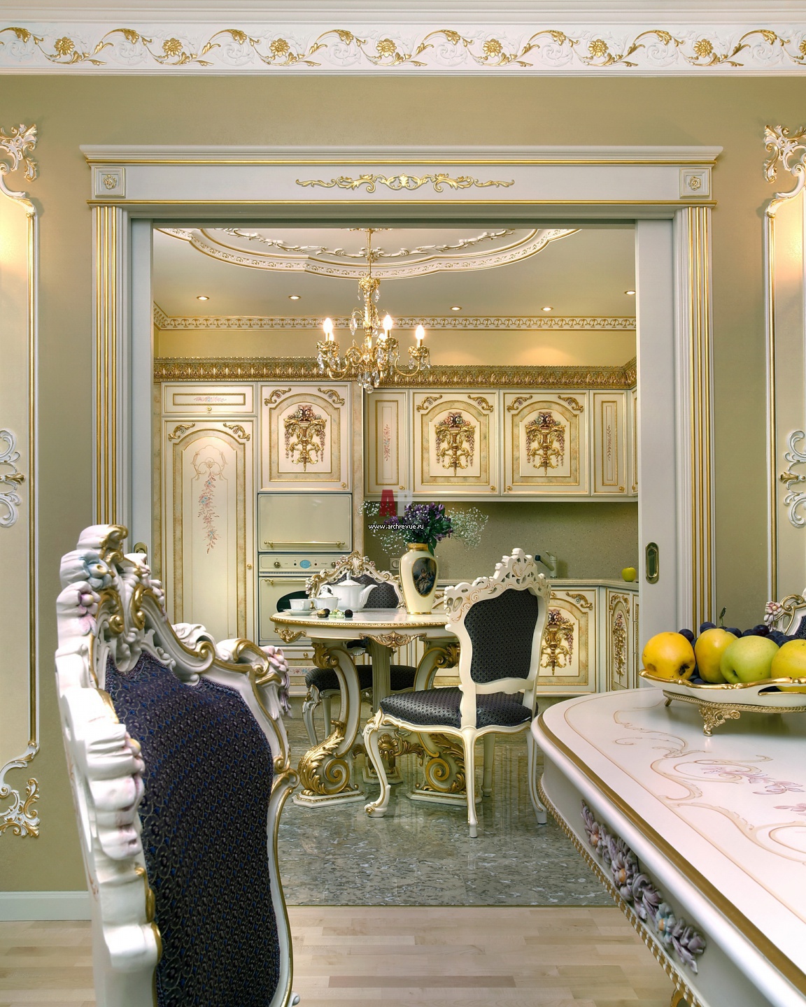 Вид на кухню из столовой. Помещения зонированы кассетными дверями. В открытом состоянии дверей не видно, когда они закрыты, кухня полностью изолирована.