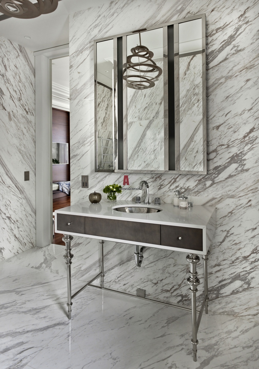 Интерьер санузла при гостевой спальне. Подстолье для умывальника в стиле ар-деко из латуни сделано на заказ. Раковина, Kohler. Светильник, Corbett Lighting. Древесина сикомора, из которой сделан стол, поддерживает цветовые вкрапления на мраморных стенах и полу.