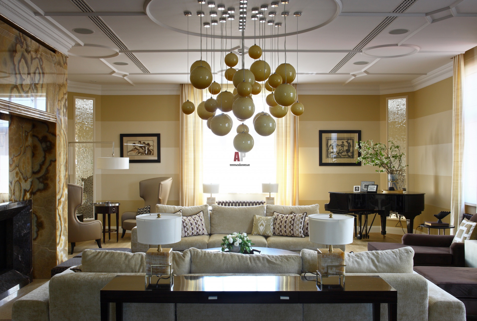 Интерьер гостиной строится на сближенных теплых золотисто-янтарных тонах. Яркий элемент – люстра Vistosi, состоящая из 32 стеклянных шаров, которые похожи на натуральный камень, она перекликается с теплым медовым ониксом портала камина.