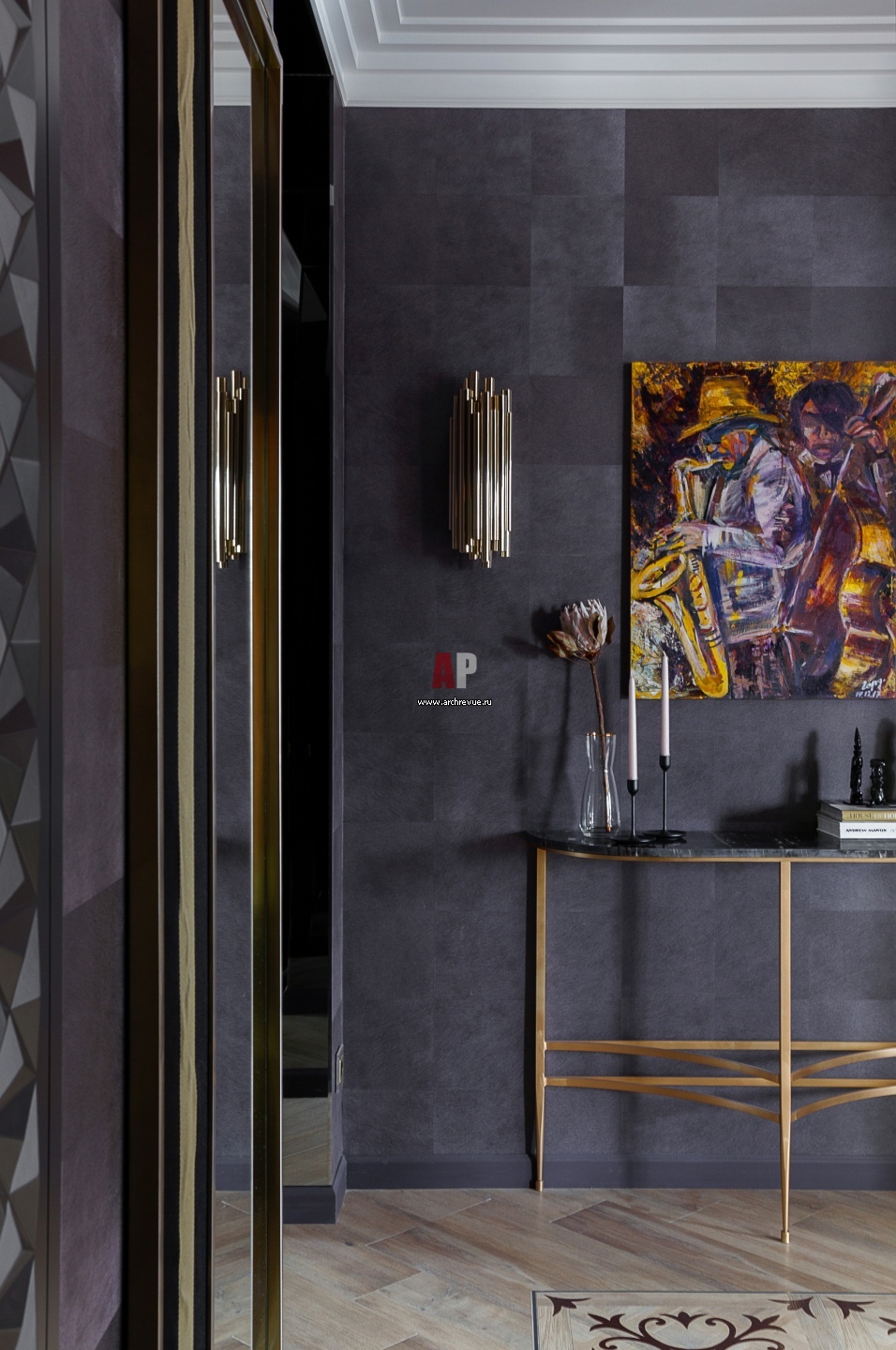 Интерьер прихожей с темными стенами и элементами ар-деко. Консоль выполнена на заказ из латуни и натурального мрамора. Картина над консолью написана автором проекта.
