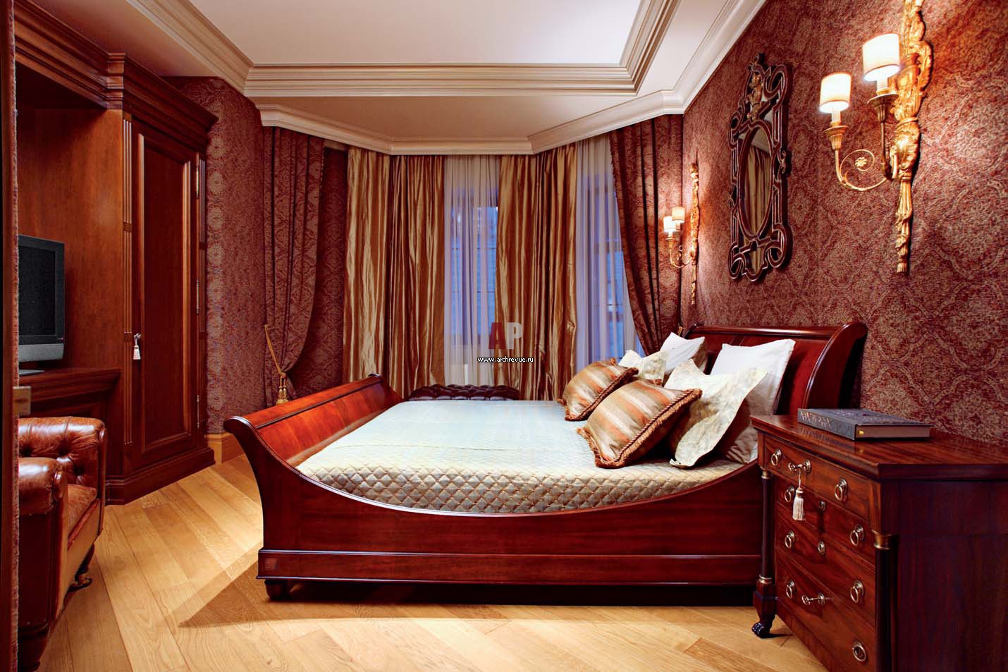 Интерьер мужской спальни выполнен в общей стилистике – текстильные обои на стенах, насыщенные тона стен, текстиля и мебели. Украшением спальни стали настенные бра.