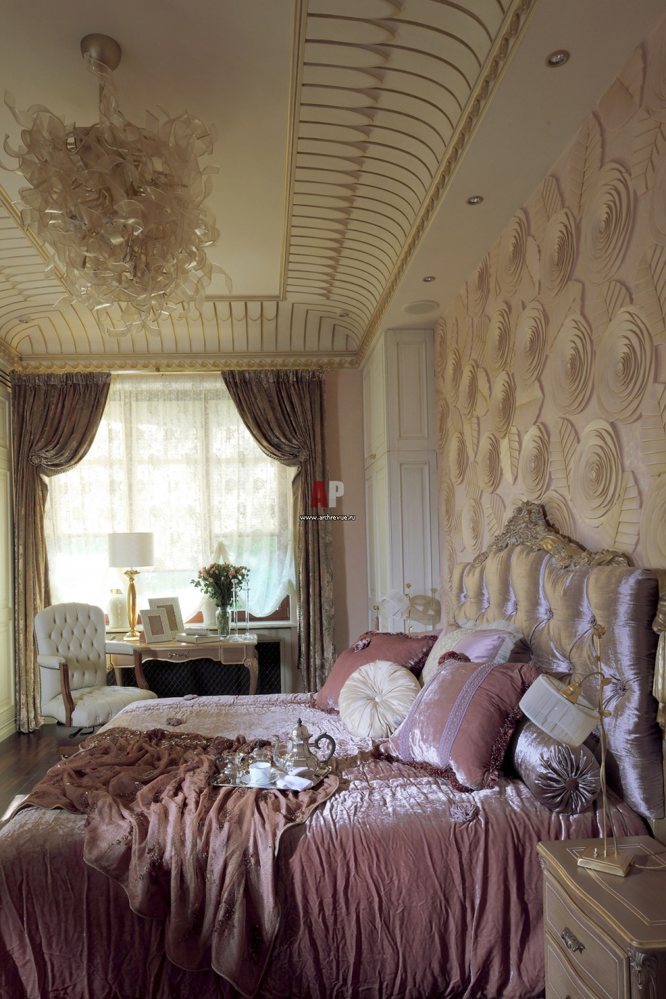 Возле окна в спальне – туалетный столик, Savio Firmino. Помещение оформлено в стиле модерн с налетом гламура.
