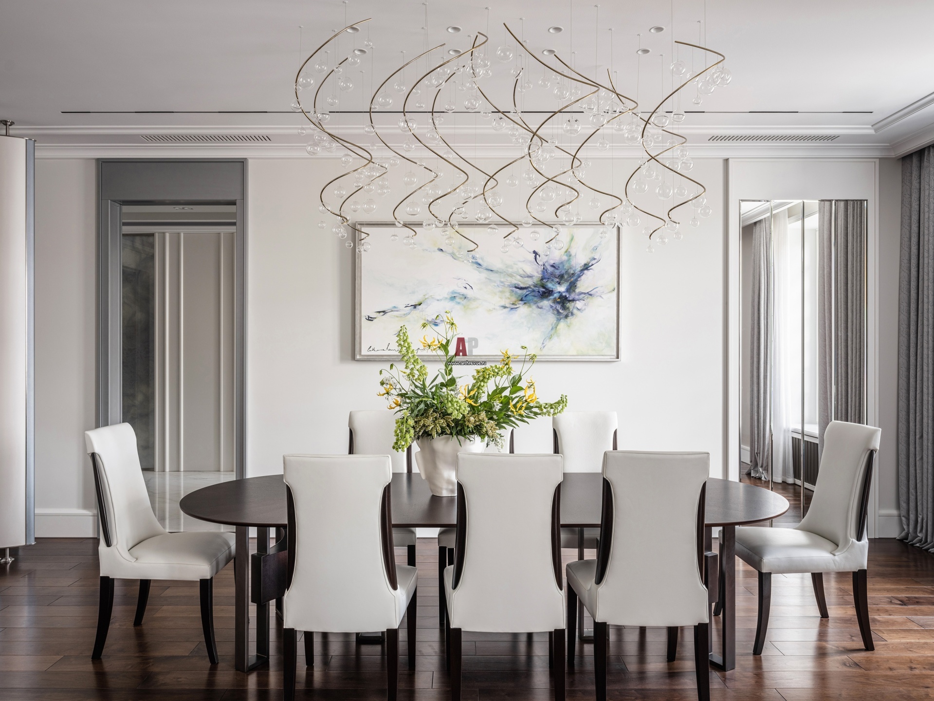 Столовая в общей гостиной. Обеденный стол, Donghia. Стулья, Michael berman limited. Люстра с эффектом каплей воды изготовлена по проекту архитекторов фабрикой Preciosa.