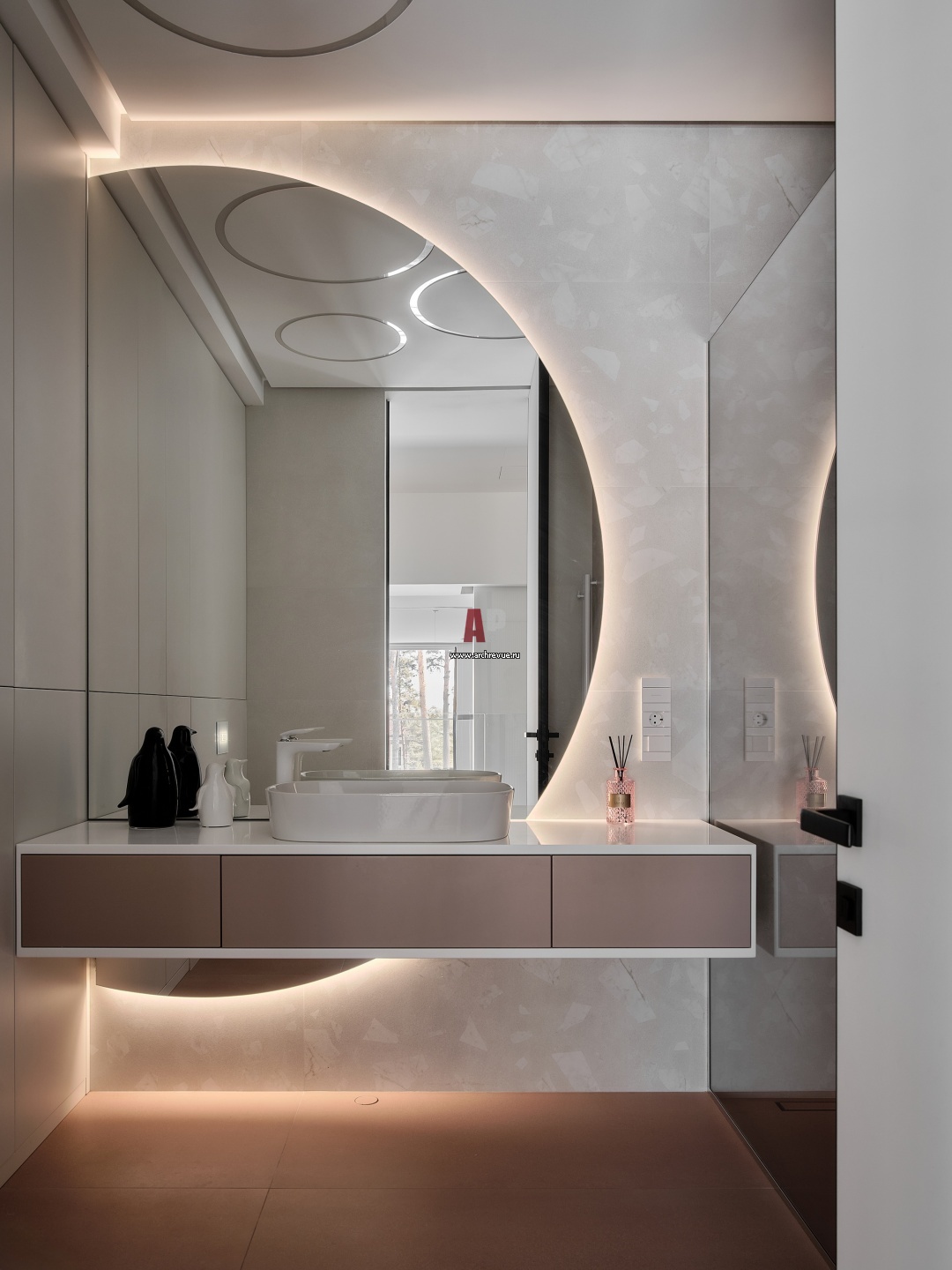 Интерьер санузла. Полукруглая зеркальная стена поддерживает тему арок и кругов.