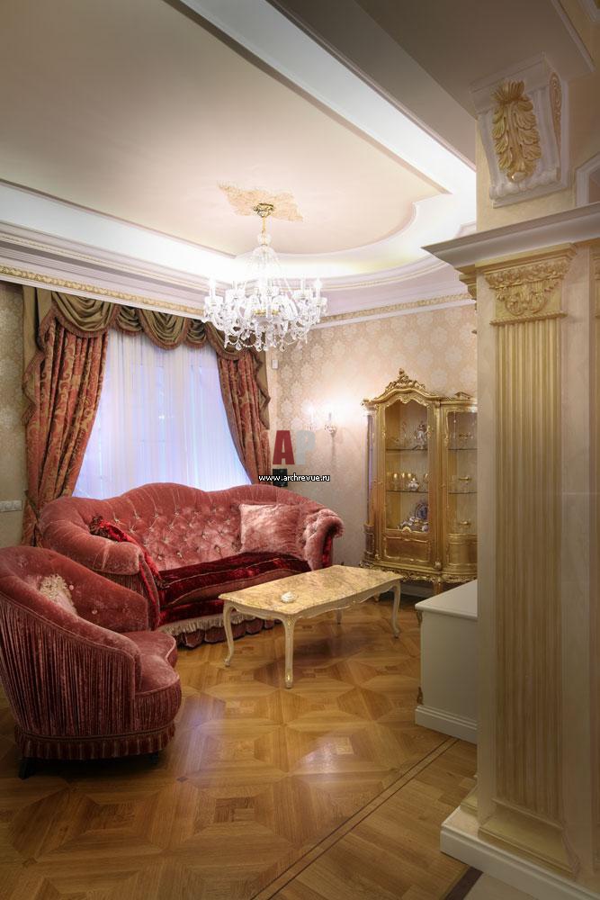 Большая гостиная разбита автором на несколько самостоятельных зон, одна из них – камерная зона ТВ, с уютными бархатными диванами. В тон к ним подобран текстиль. Текстильный дизайн «Флэт-интерьеры»