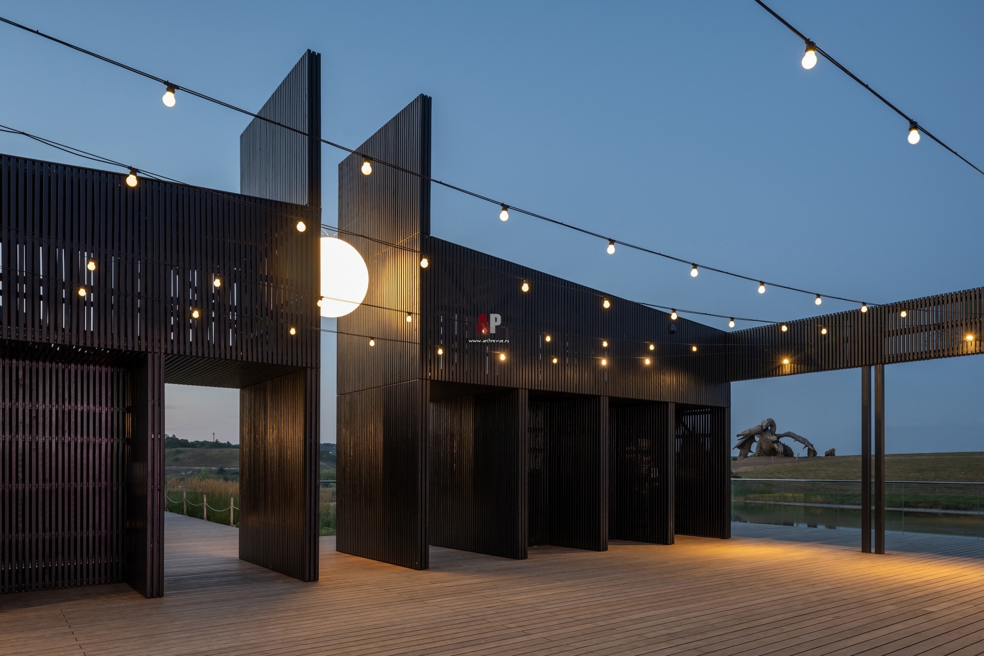 Центр гостеприимства в парке «Кудыкина гора». Зона стритфуда. Сказочную атмосферу создает освещение – светильники-звезды и огромный светильник-шар в виде полной Луны.