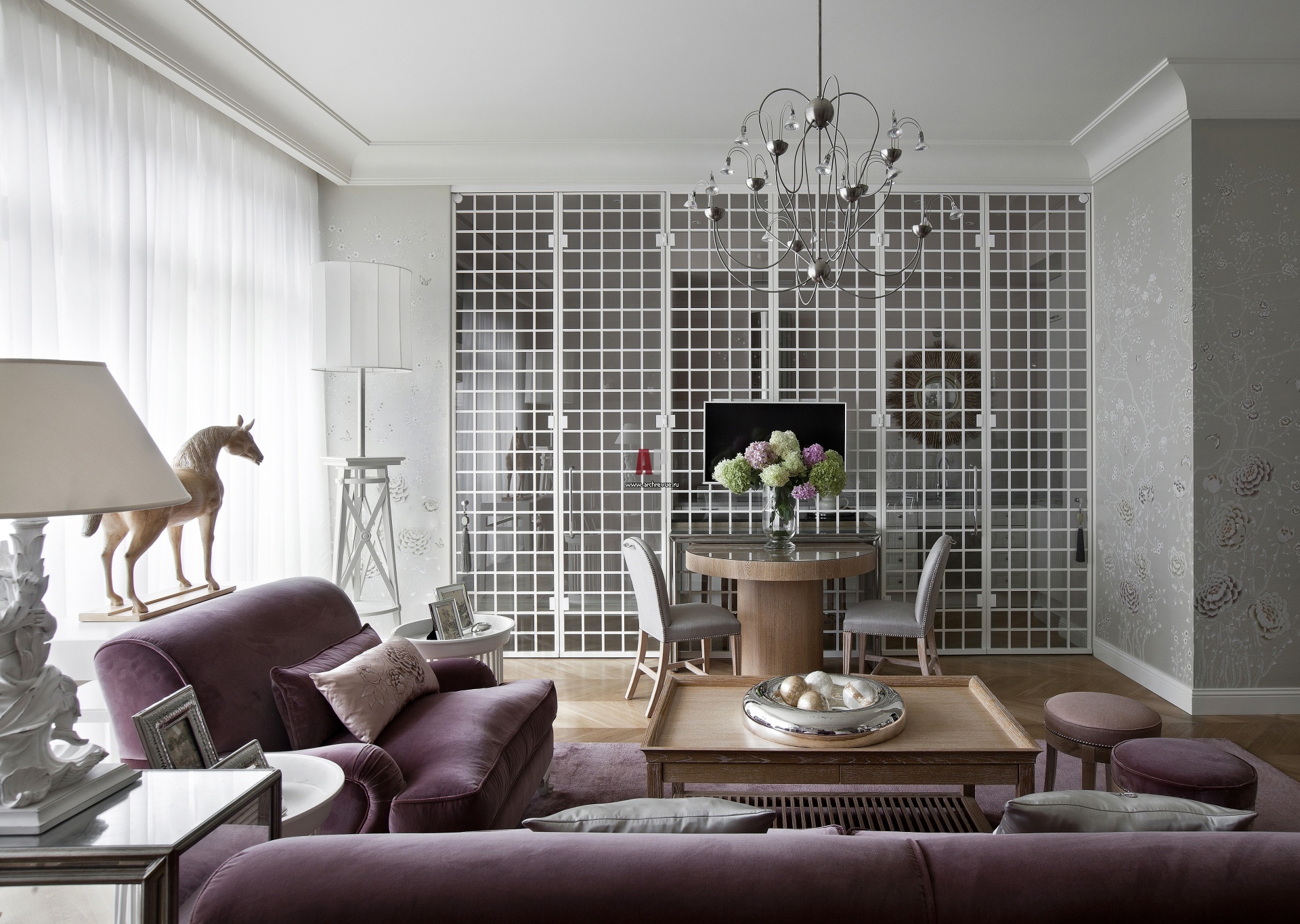 Декоративная перегородка в гостиной имитирует садовое сооружение – берсо. Перегородка набрана из нескольких модулей, которые сдвигаются автономно по принципу ширмы. Люстра, Lambert.